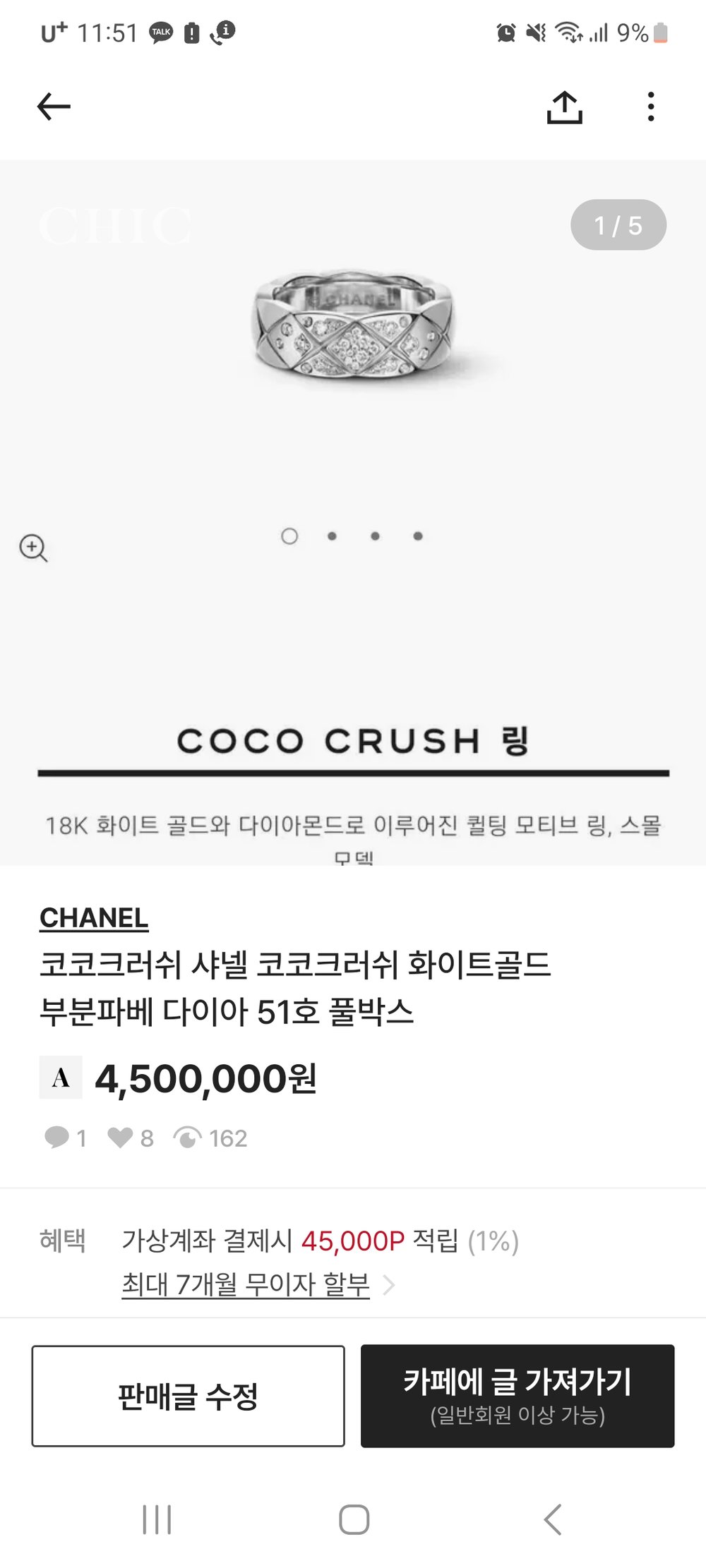 샤넬 코코 크러쉬 부분파베 화이트골드 링SMALL, 화이트골드, 세미 파베, 51호